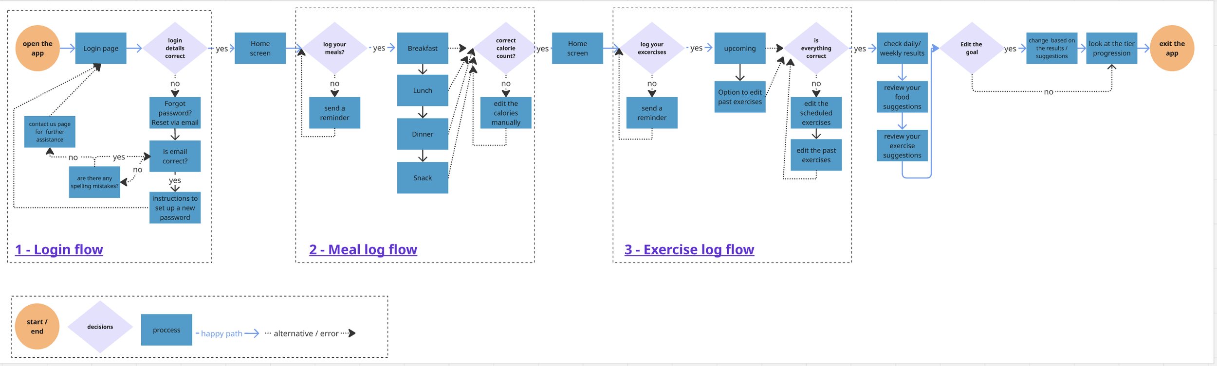User flow - I mapped out a high-level user flow covering key touchpoints, including account authentication as well as meal and exercise logging. This served as the blueprint for the wireframing stage, ensuring a seamless transition between the app's core features.
