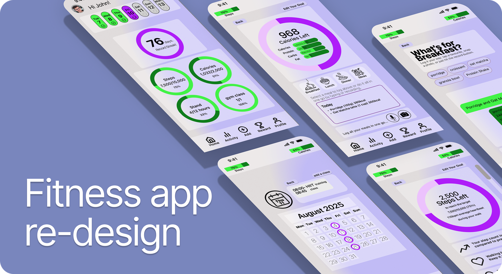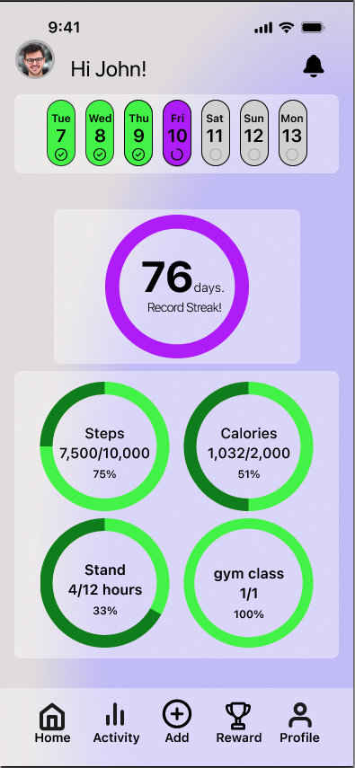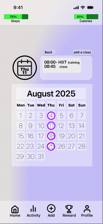 Prototyping & Feedback: I landed on a layout featuring a revolving top calendar and simple bottom navigation, influenced by the Apple VisionOS aesthetic. The journey starts on the homepage with interactive rings for steps, calories, and gym classes. This structure remains consistent throughout; each section opens to a dedicated page centred on a large target wheel, supported by trend data and encouraging messages to drive engagement.