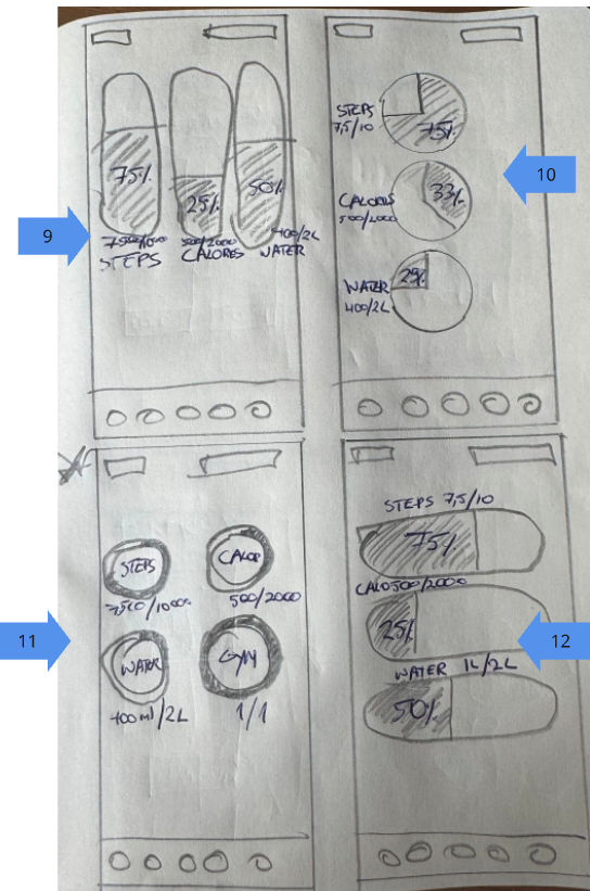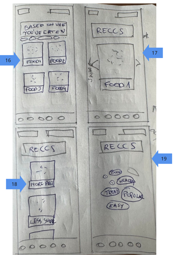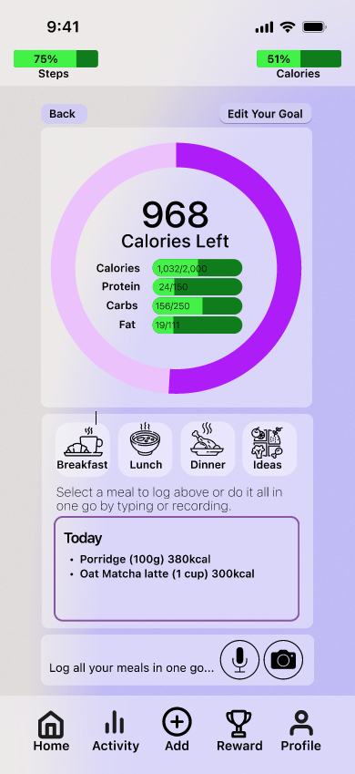 I explored various data visualisations before selecting a minimalist pie chart to maintain a modern aesthetic, while user feedback prompted me to pivot from a static time panel to a scrollable calendar. For food logging, I prototyped three concepts, ultimately settling on a chatbot-inspired interface that supports keyboard, camera, and voice input. This final direction, refined in Figma, centres around a prominent data wheel.