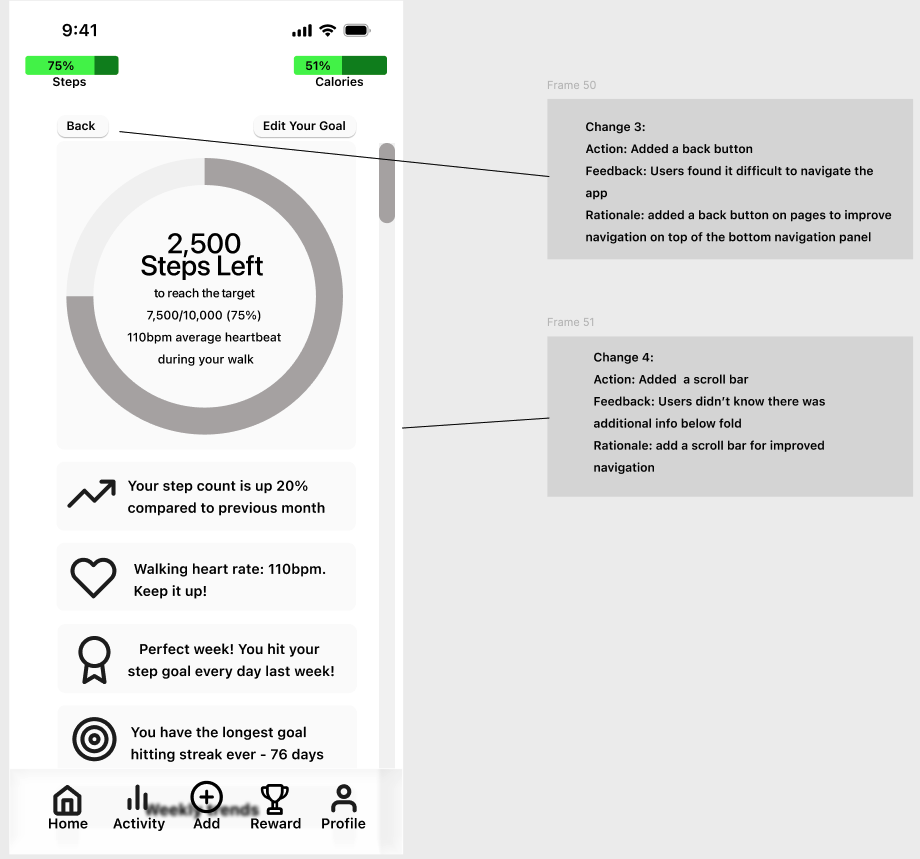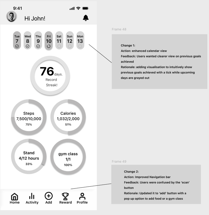 Based on user feedback, I introduced a navigation tab and replaced the original “scan” button with a Quick Action “Add” button. This allows users to log calories or gym sessions directly from any screen, significantly reducing task completion time and improving overall accessibility.