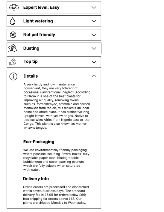 Density Control: I moved all long-form content and detailed care guides into collapsible containers. This prevents users from getting overwhelmed while still providing deep-dive details for those who choose to seek them out.