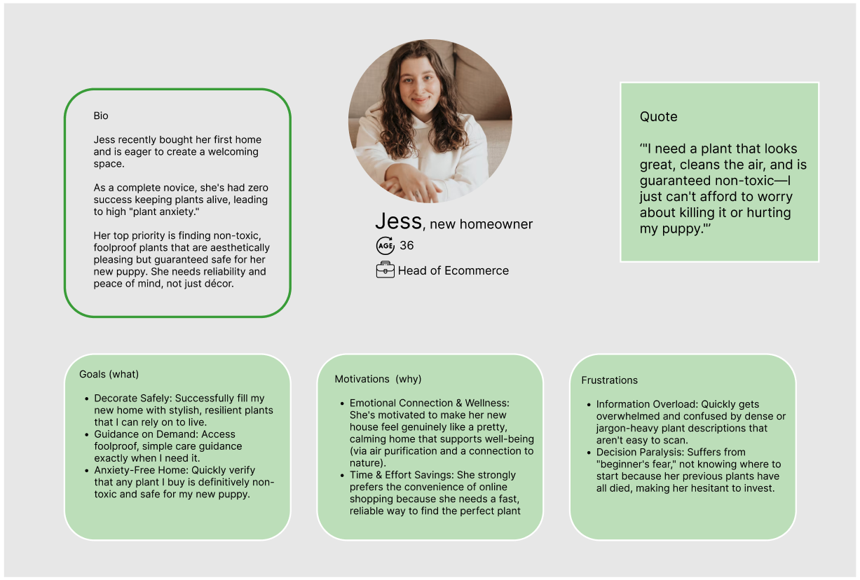 Based on user interviews, I developed Jess—a 36-year-old new homeowner with a puppy. Jess craves a beautiful, homely aesthetic but is notoriously bad at keeping plants alive. Her primary conflict is simple: she needs easy-to-care-for, non-toxic plants, but she fears buying something unsuitable and watching it die. Her anxiety demands ultra-high confidence and clarity from the product page.