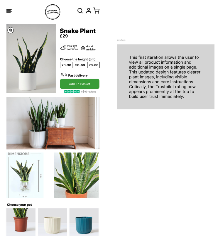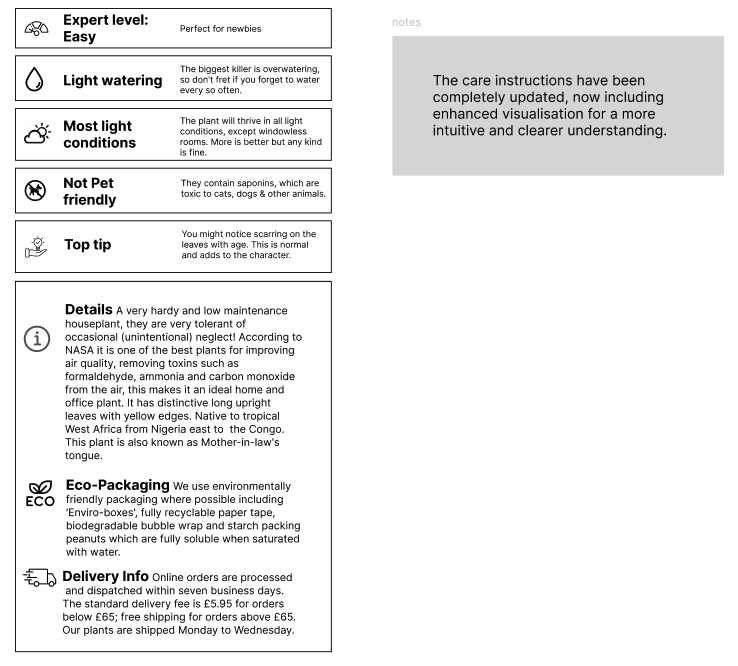 Clutter Obscures Clarity: Product pages were visually cluttered. Essential cues for care (light, water, and pet safety) were hard to spot, causing instant friction and hesitation for the user.