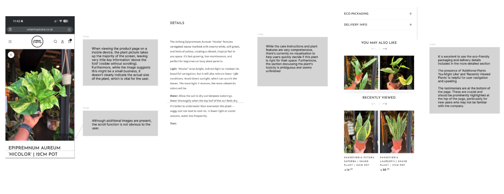 While Urban Tropicana’s selection aligns with key competitors like Patch, Leaf Envy, Plant Drop, and Prickle, the website design required significant improvements to stand out. Our Customer Journey Map confirmed that new, unfamiliar users face two major pain points: finding information quickly in an oversaturated market and establishing immediate trust.